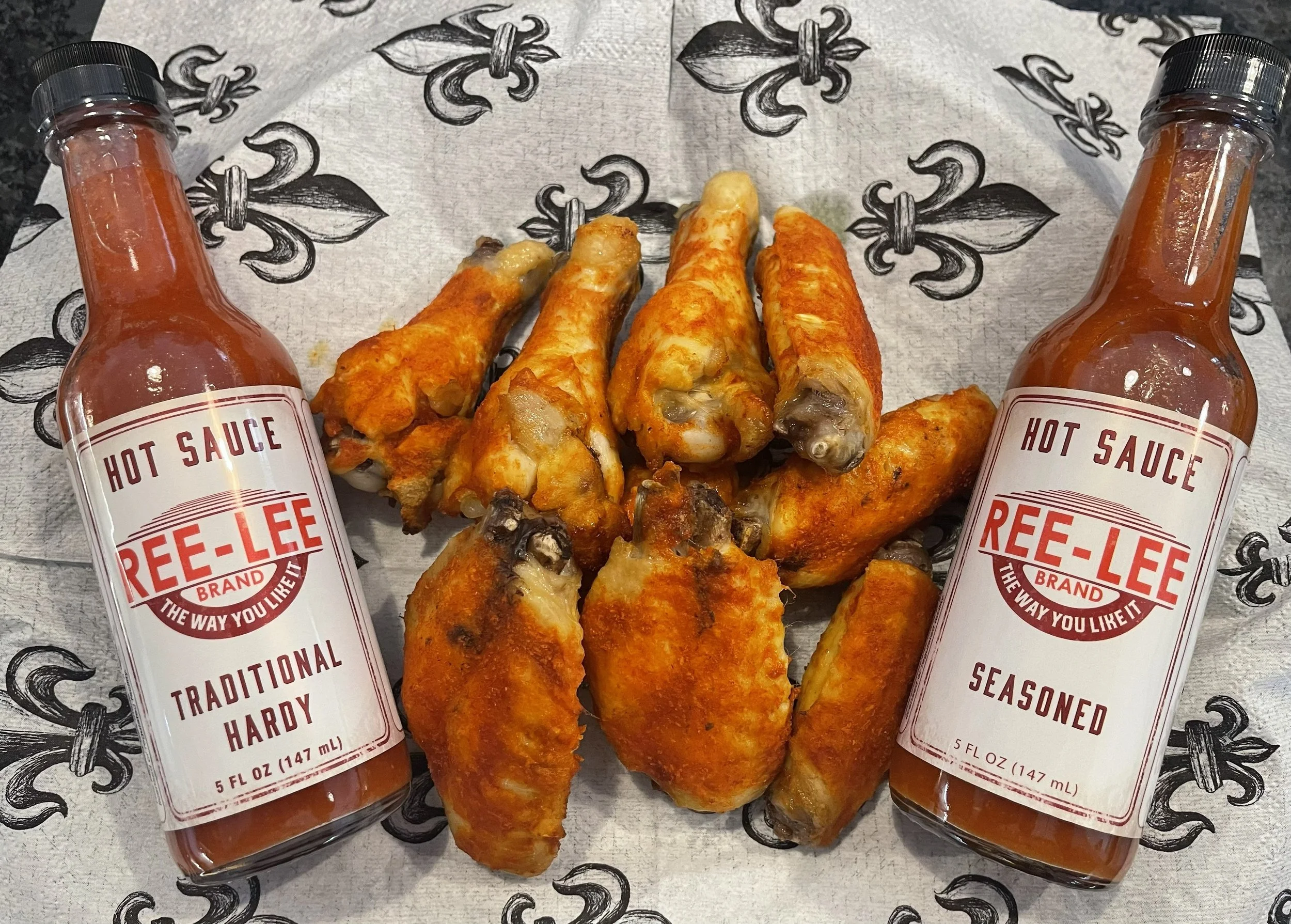 Arrange the wings in the pan and generously coat one side with REE-LEE Traditional Hardy and/or Seasoned Hot Sauce.